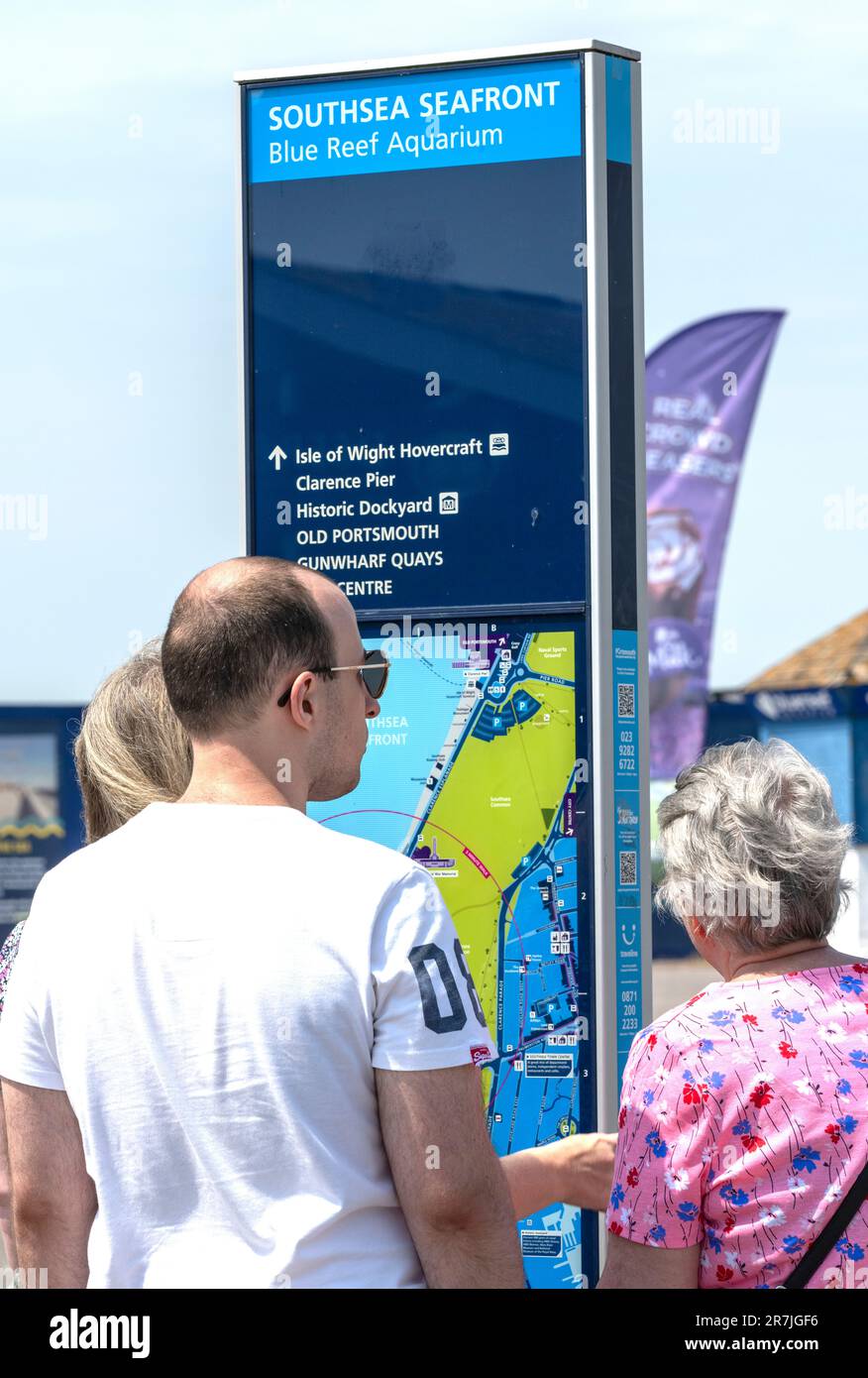 Tourists consulting public map on Southsea Seafront, Southsea