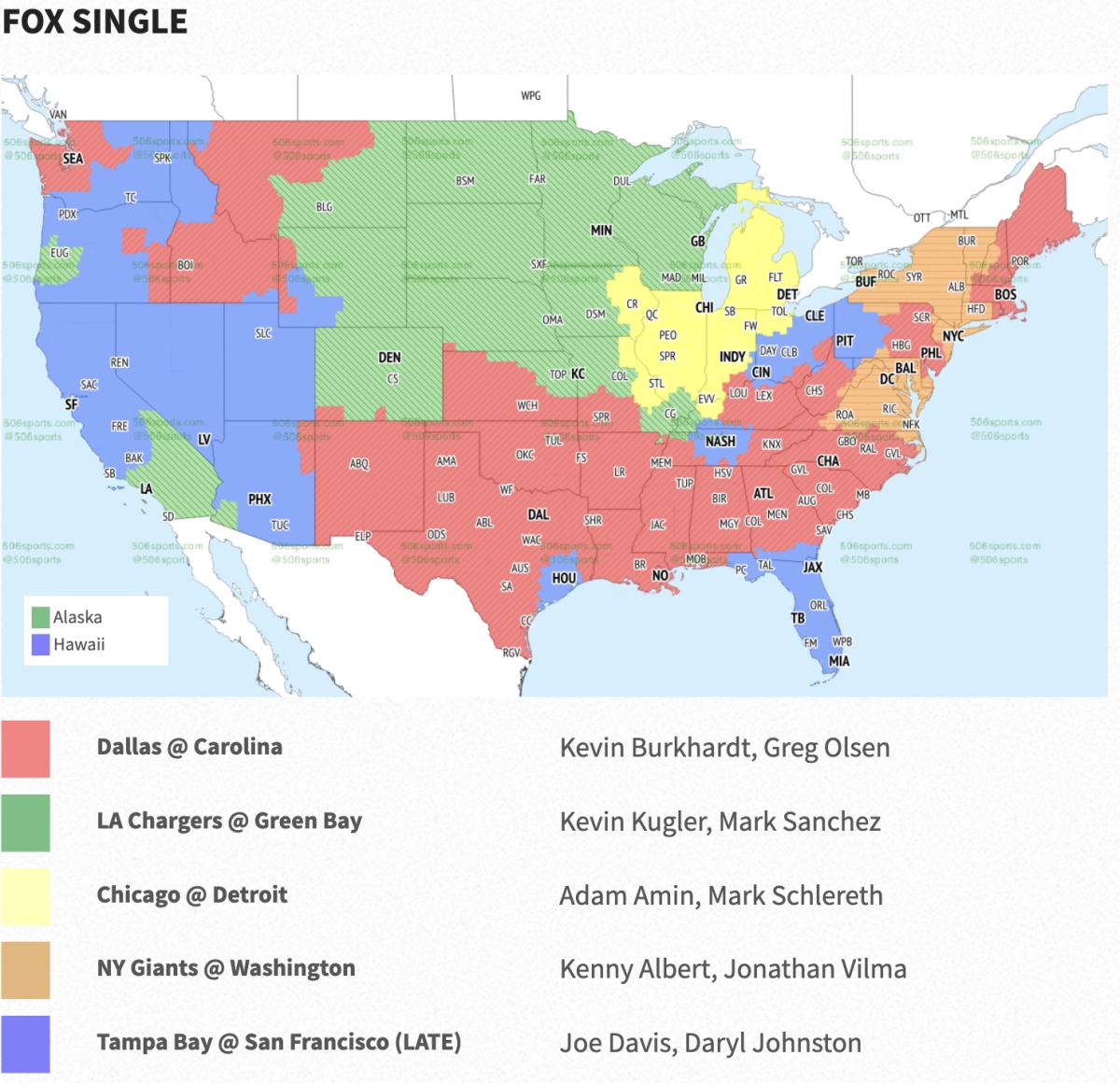 Nfl Week 11 Map NFL Week 11 TV coverage maps: CBS will air two games and FOX will air one in each market. Check out which games will air in your areas on Sunday in Week 17. . including a three interception game in Week 11 against the Lions. Will you be able to watch the game on TV? If you live in any of the green areas on the below map, you will be able to watch the .