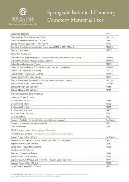 Springvale Botanical Cemetery Cemetery Memorial Fees Southern